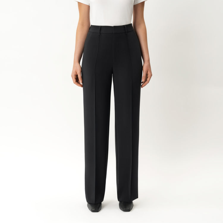 Designed for work and beyond, these relaxed-fit trousers blend structured sophistication with effortless ease. Crafted from luxurious stretch crepe, they offer an impeccable drape and refined texture while ensuring all-day comfort. A hidden elastic waistband provides a seamless fit, while tailored details like a front pintuck pleat and dart accents elevate the silhouette.