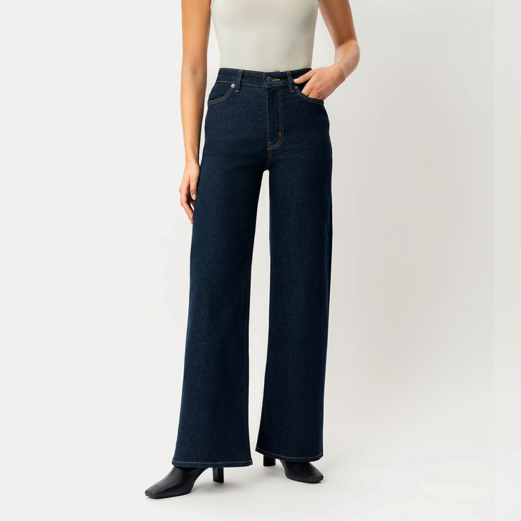 Experience the classic look of denim with the comfort of incredible stretch. Our high-waisted, wide-leg jeans are crafted from a proprietary denim blend that’s both very stretchy and thick, providing the feel of traditional denim with added flexibility. Versatile and perfect for everyday wear, these jeans are a must-have in your capsule wardrobe.