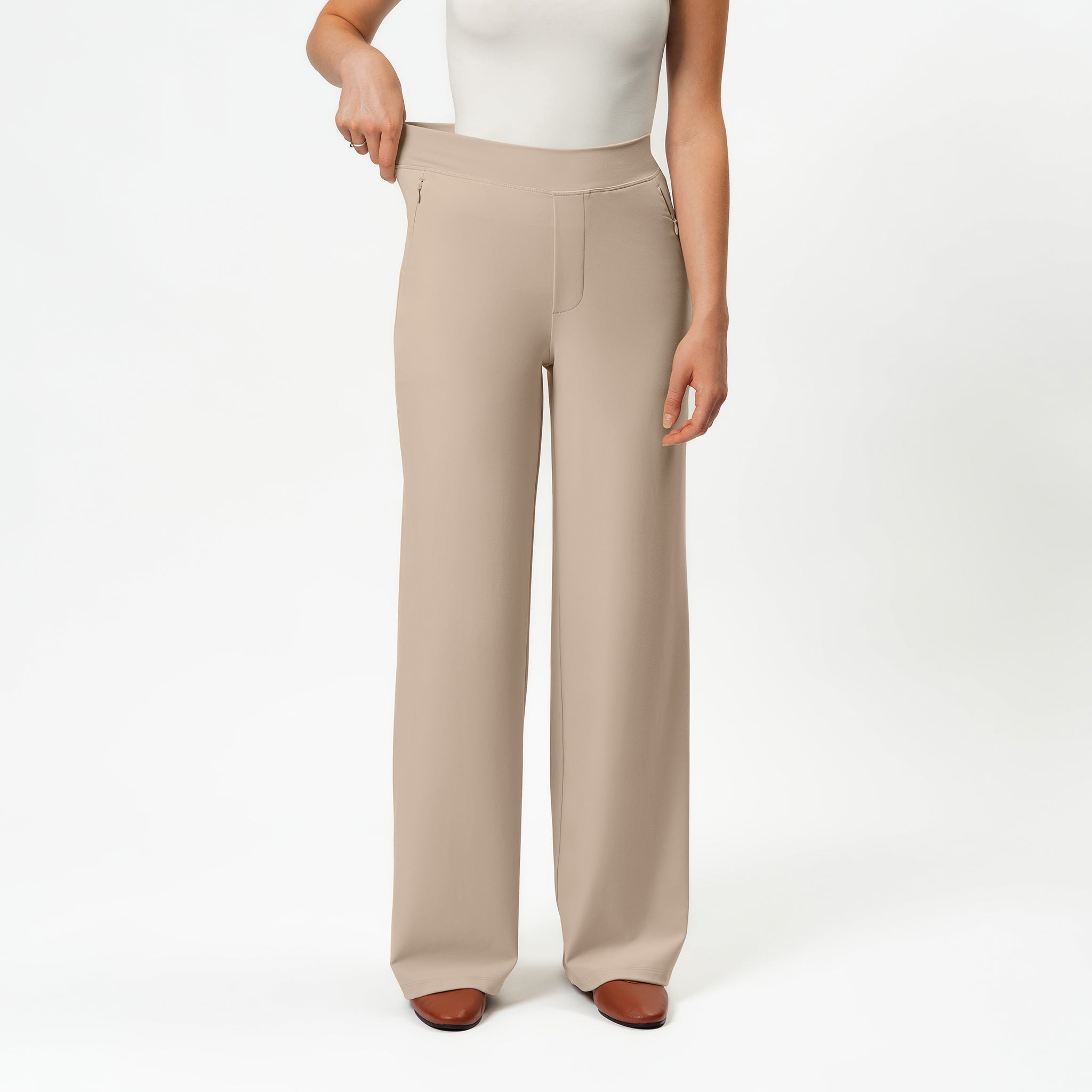 Introducing the Asana Wide Pants – the ultimate "everything" pants. Designed with a looser fit at the thighs and a wider leg, these pants feature discreet zip pockets, a high centerfold waist, and are crafted from soft brushed activewear knit. Perfect for casual outings, work, dance, travel, and lounging, they are your go-to for comfort and style every day.