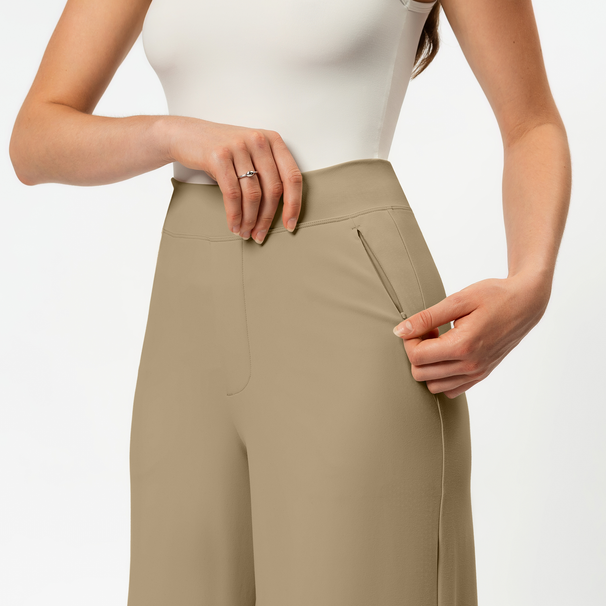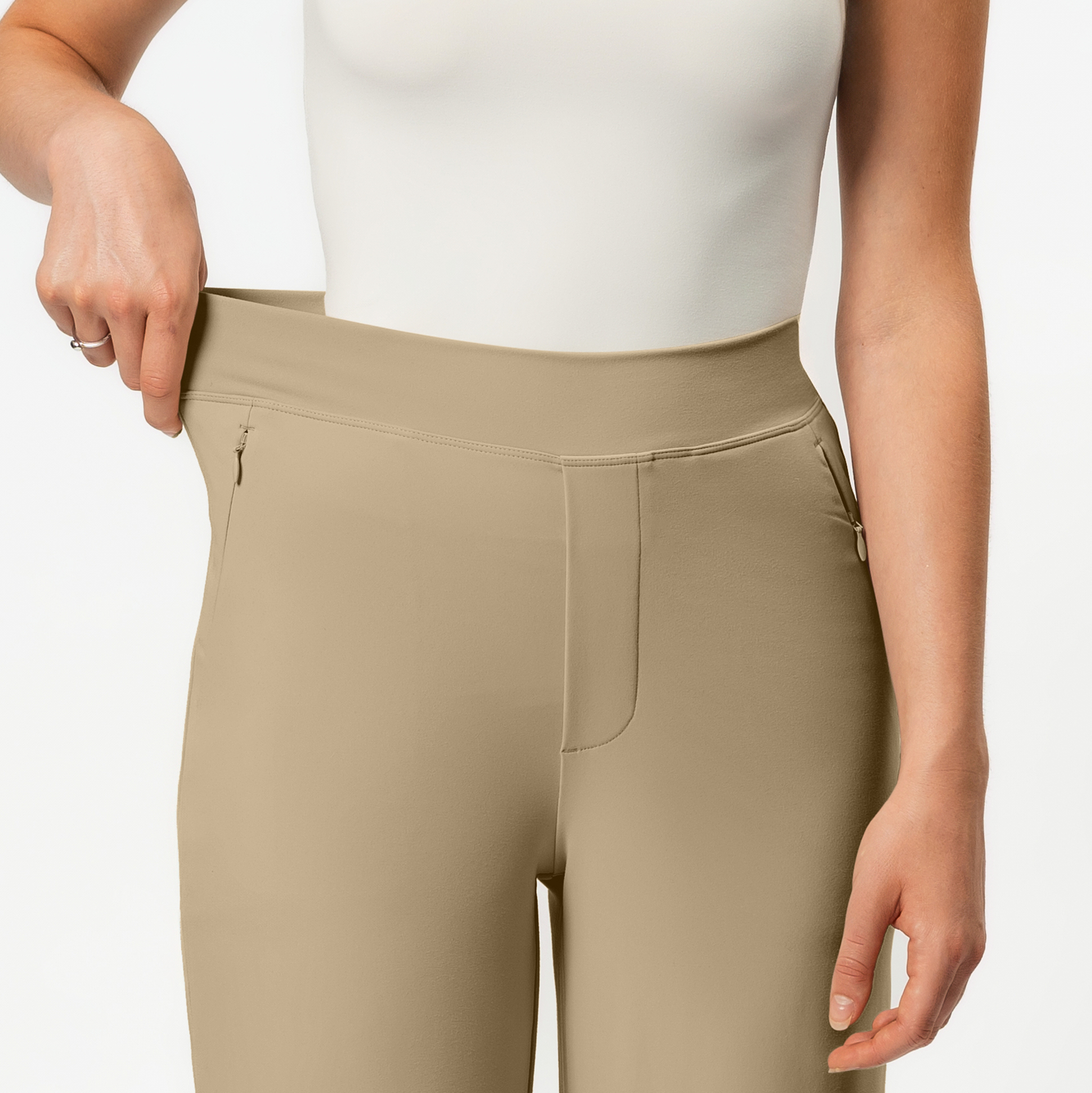 Creating a comfortable, non-digging, minimal waistband was key for these pants. We tested multiple designs—elastic-cased, stable front with elastic back, and more. After extensive sampling, the centrefold no-seam folded waistband emerged as the best, relying on the base fabric’s stretch to maximize comfort.